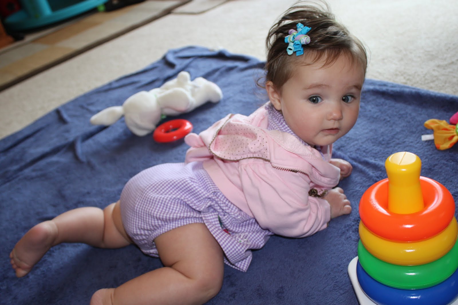 She's been turning circles when she's on her tummy. Sometimes she gets up on her knees, but then she dives forward to reach for toys.